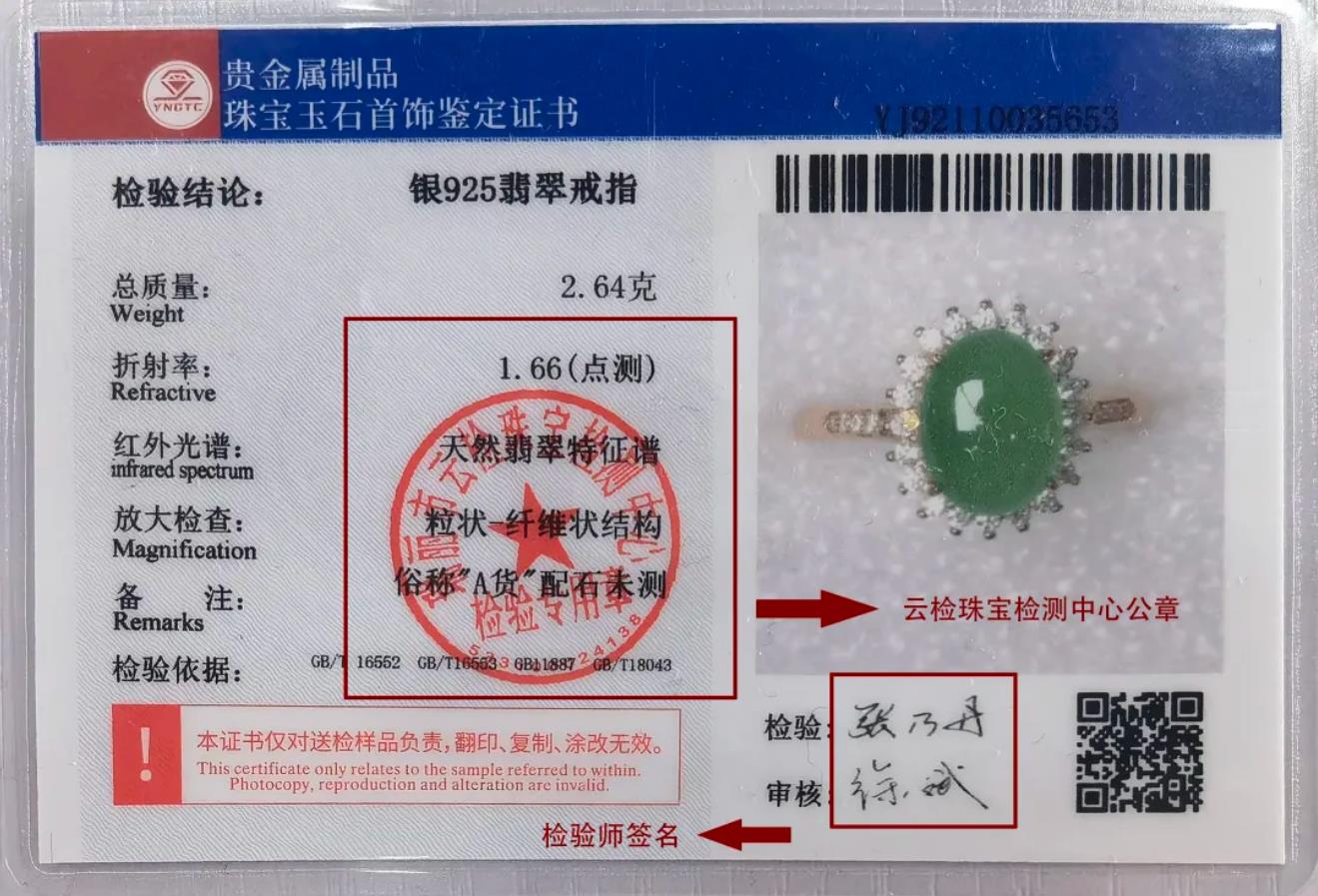 九球直播珠宝玉石首饰鉴定证书背面有单位公章和检验师签名