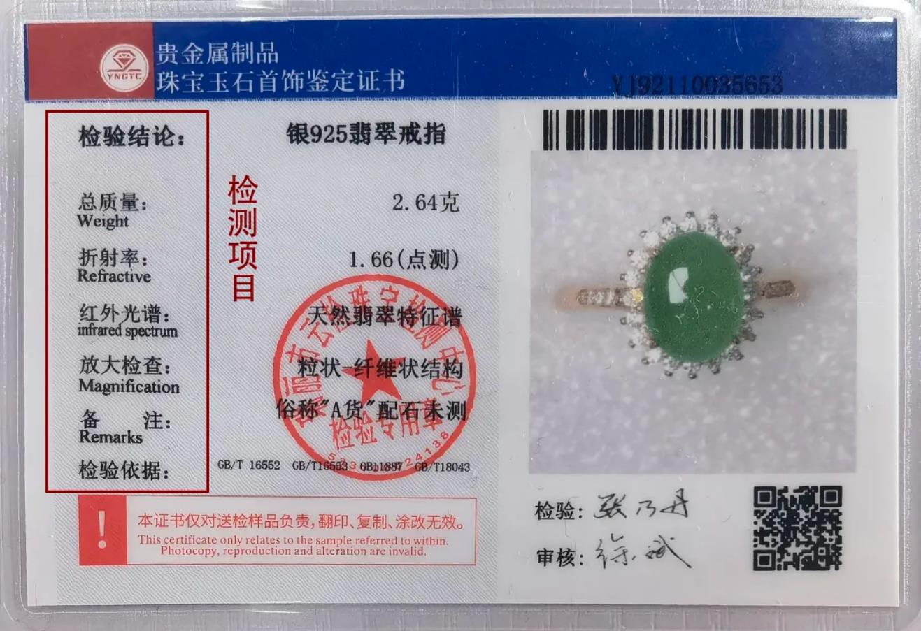 九球直播珠宝玉石首饰鉴定证书背面有“检测项目”
